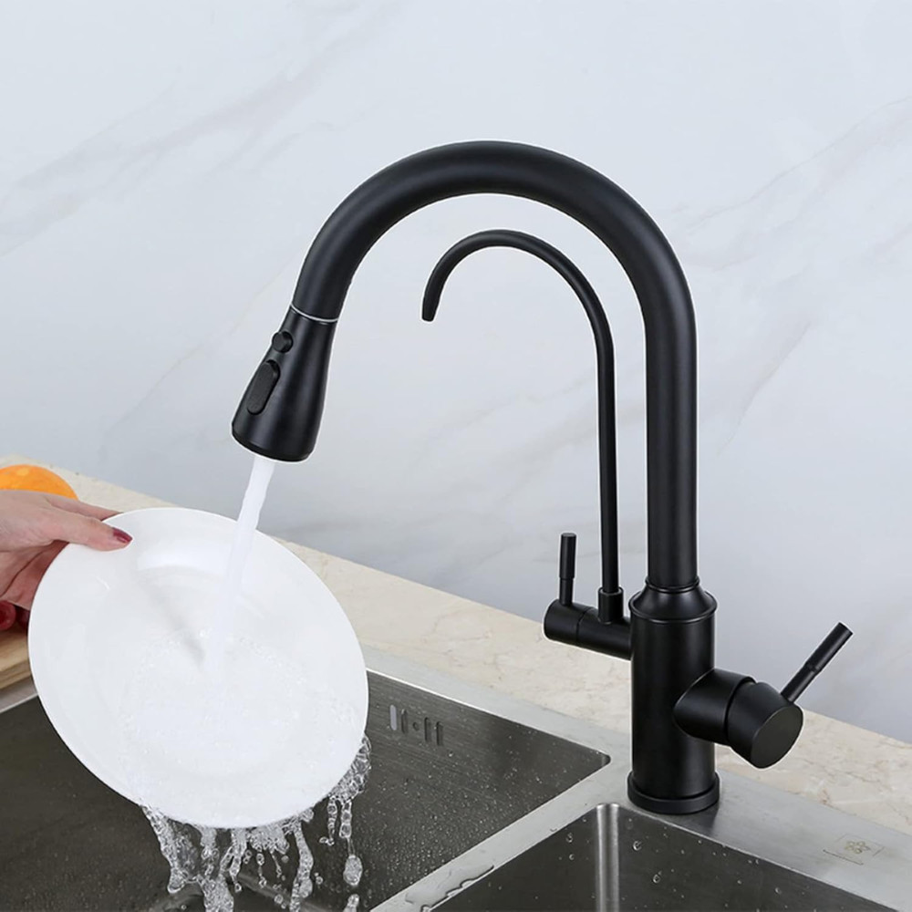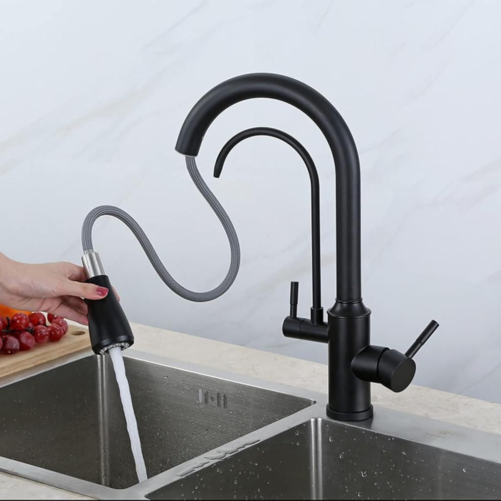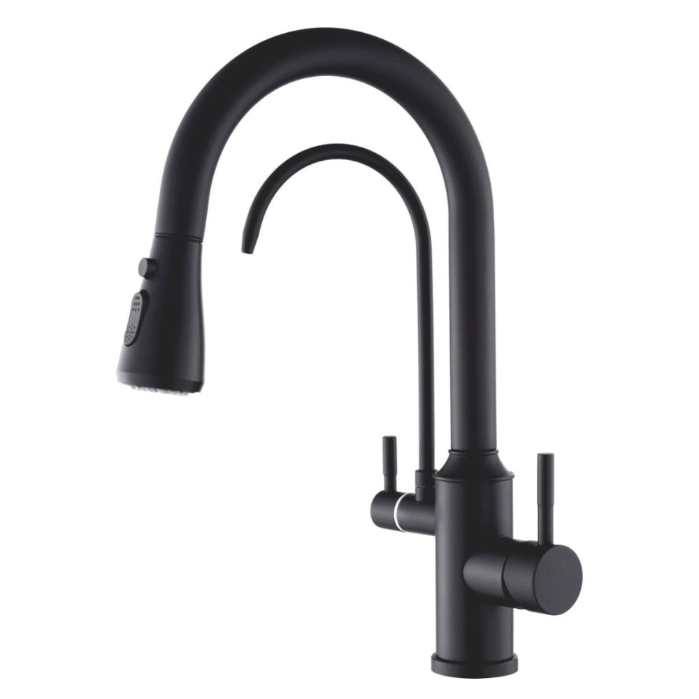Welland Riva 3 utas csaptelep kihúzható többfunkciós fejjel, valamint elkülönített, beépített második csapteleppel a tisztított víz számára. Nagy tartósságú fekete porfestett felülettel, amivel egy kortalan de mordern formatervezés párosul.