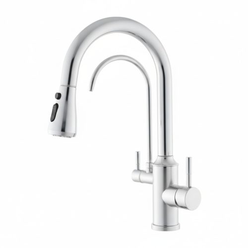 Kihúzható fej: a csaptelep szórófeje 60 cm-es hosszúságig kihúzható.Váltókapcsoló: a víz kifolyása normál és zuhany üzemmódban állítható a váltógomb segítségével.Tisztított víz kiállás: A csaptelepen egy második csaptelep került kialakításra, egy külön keverőkarral. A tisztított víz számára elkülönített kivezetés, ami a csaptelepen kialakított harmadik bekötéssel csatlakoztatható a hálózati hideg és meleg víz mellett. Ezáltal a szűrt víz sosem keveredik a szűrés nélküli csapvízzel. A bepített vízszűrőből érkező víz egyszerűen csatlakoztatható a harmadik kiálláshoz.