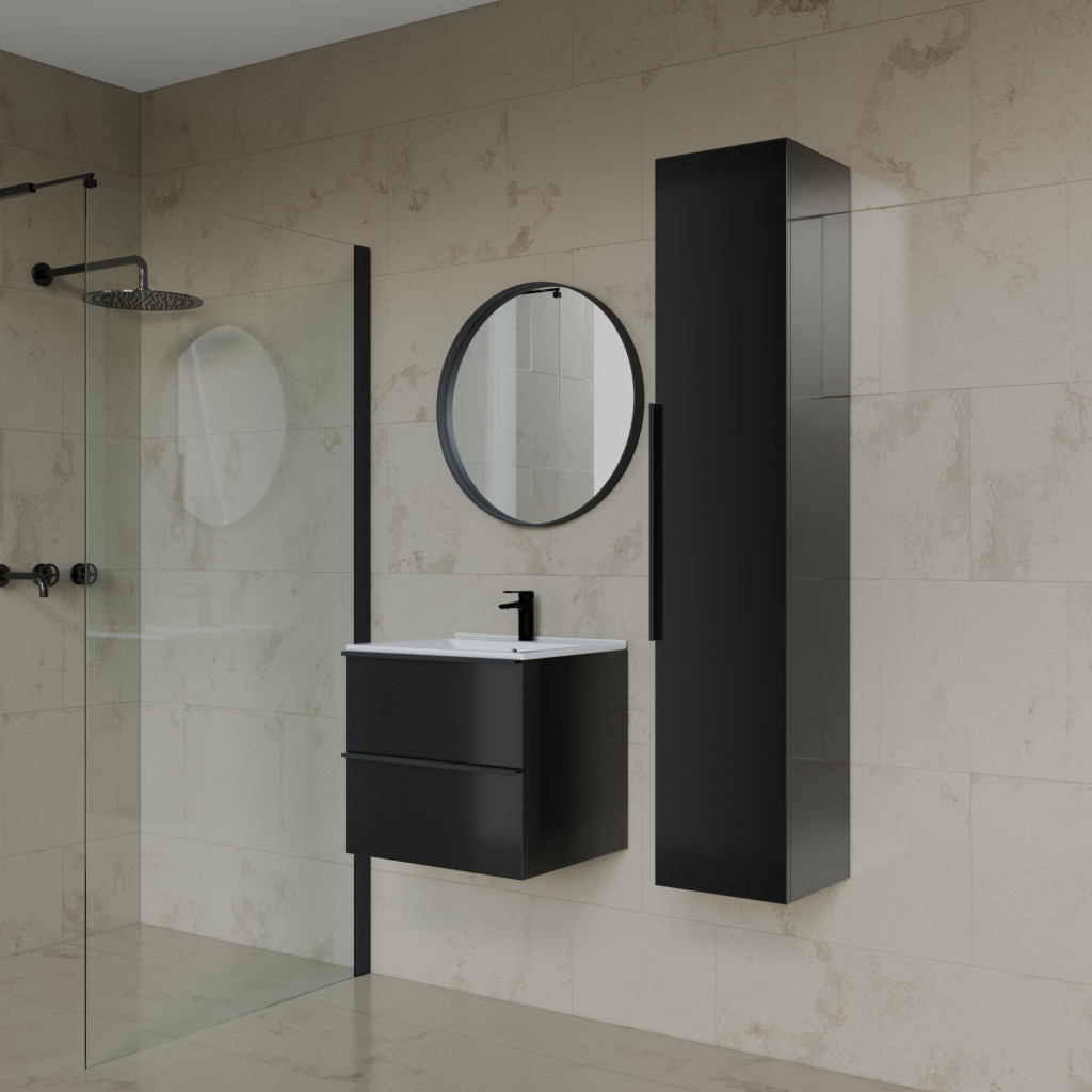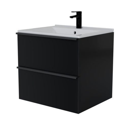 Intenso fiókos mosdószekrény magasfényű fekete felülettel. A fiók előlapok mellett az oldalak is magasfényű felülettel rendelkeznek. 2 fiókos mosdószekrény, modern, hosszított kialakítású fekete fogantyúkkal az fiókokon. 15 mm vastag fiók front bútorkapok és korpusz. Az élek ABS élfóliával vannak lezárva, ami egyszerre esztétikus és véd a beázás ellen. A bútorszett lapra szerelve, gyári csomagolásban kerül kiszállításra.