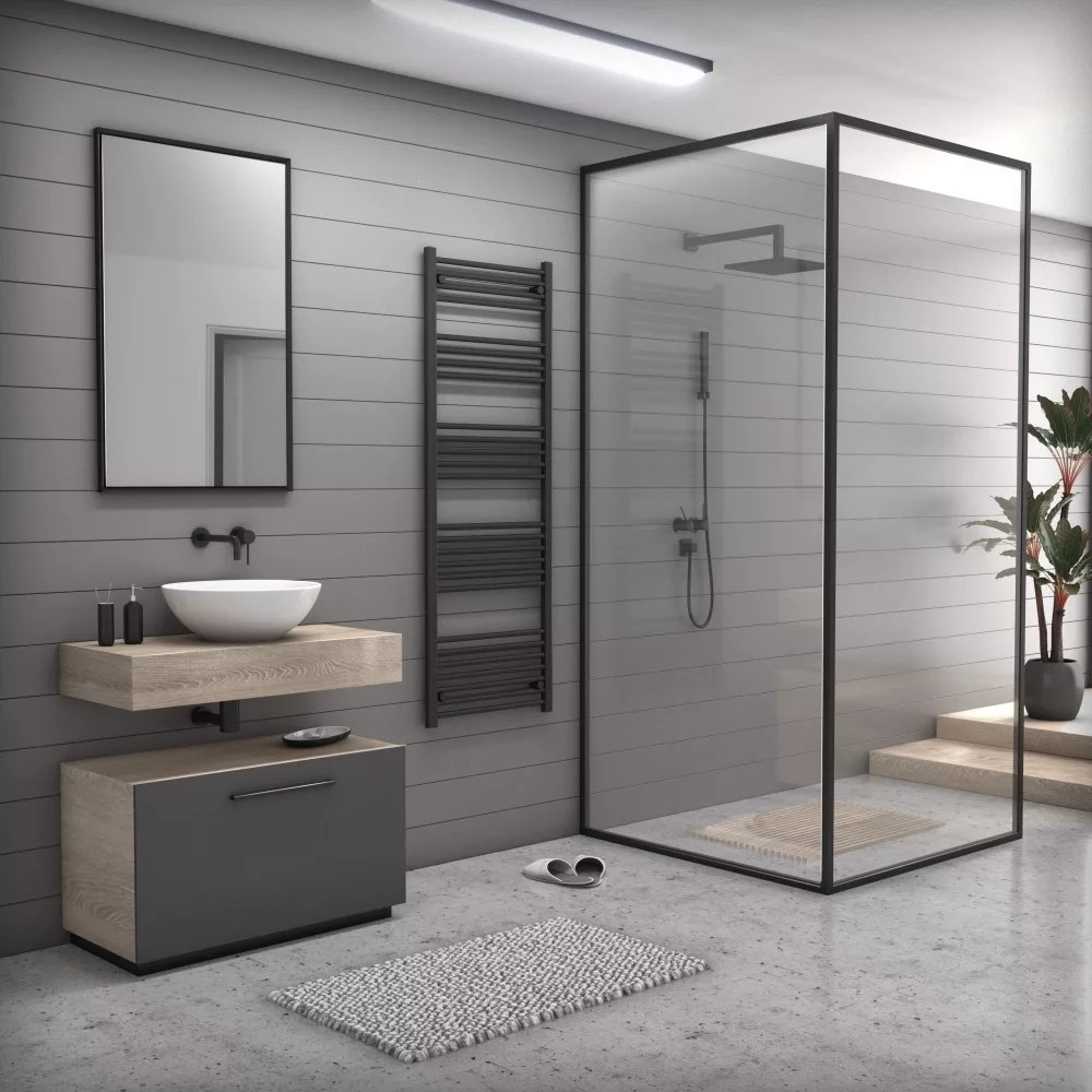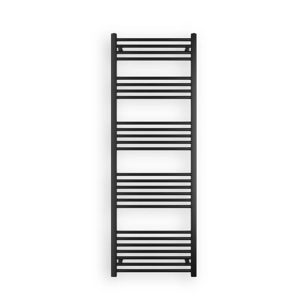 Törölközőszárító radiátor 60 x 170 cm-es méretben, fekete színben. A radiátor tartozéka a rögzítő konzolok és menetes dugók. A Nero Italia fürdőszobai radiátorok kimagasló gyártási minőségben előállított termékek, első osztályú acél felhasználásával készült, precizíós, nagy tartósságú és egyenletes fekete porfestett felülettel.