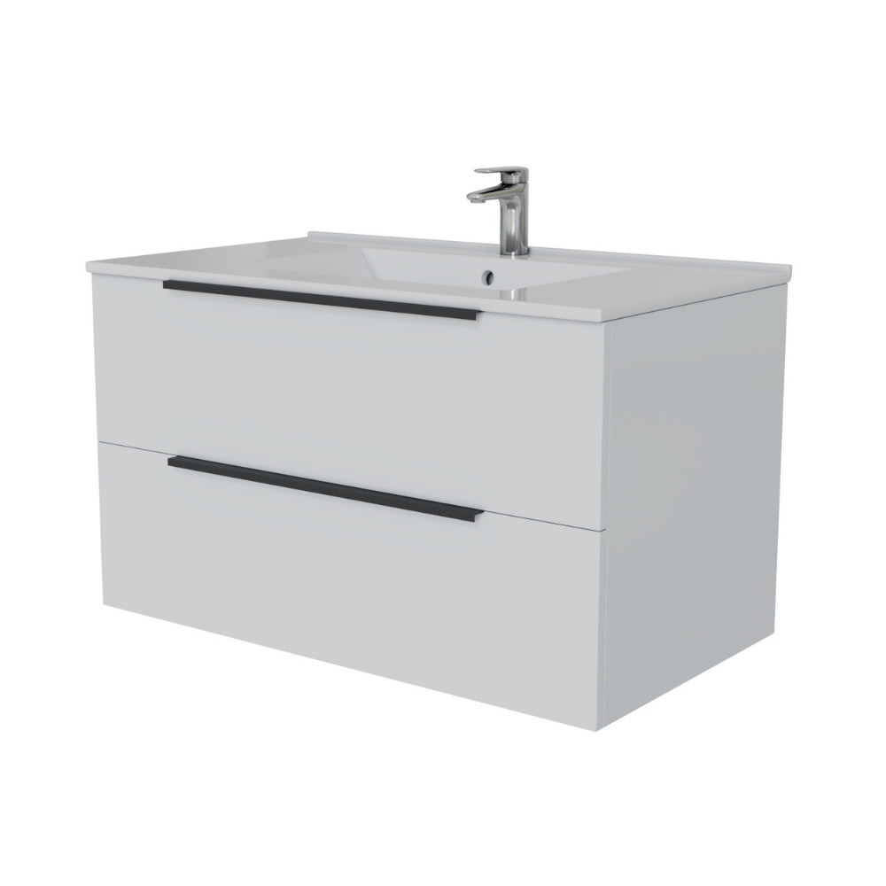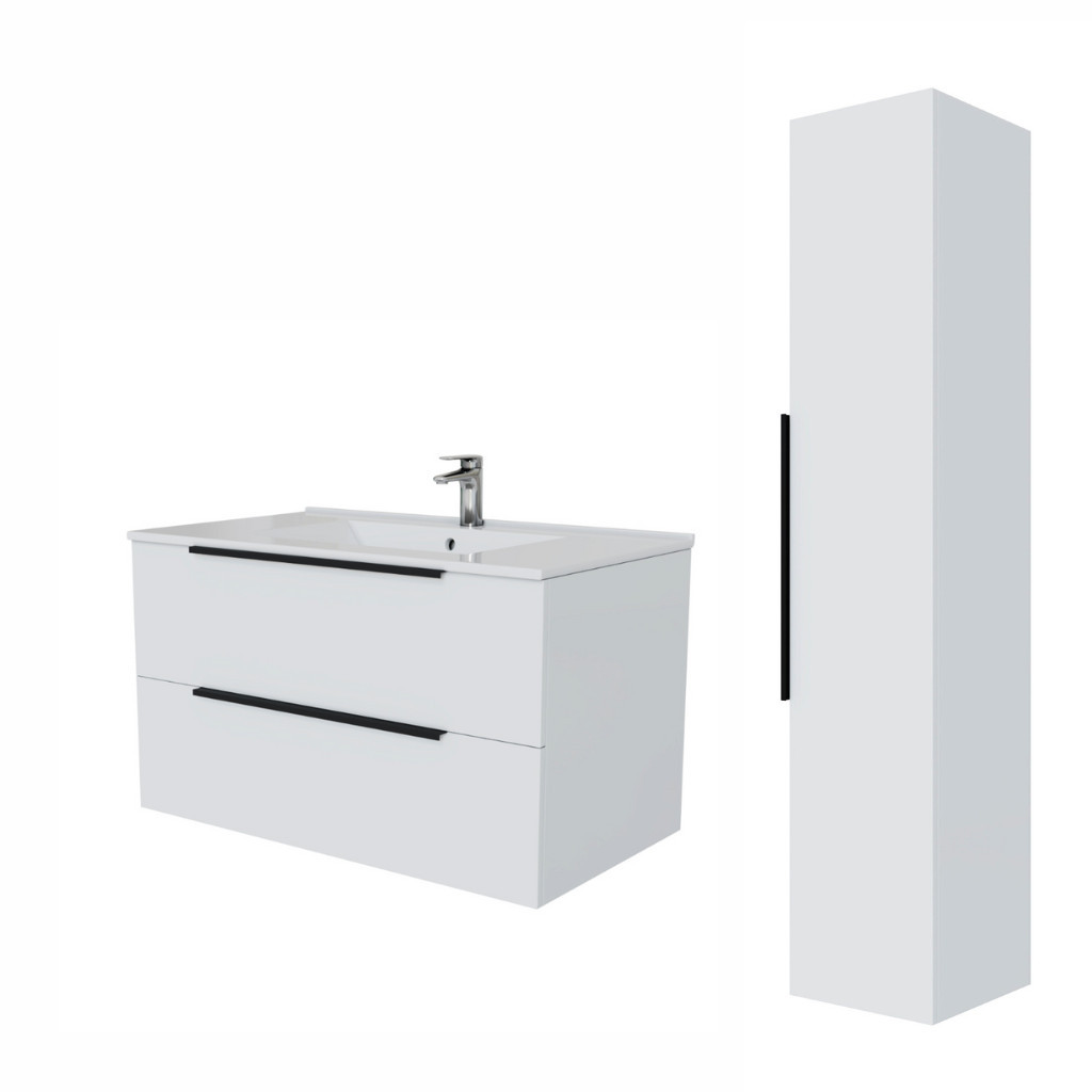Intenso fiókos fürdőszobai alsószekrény mosdókagylóval, magasfényű fehér felülettel. A fiók előlapok mellett az oldalak is magasfényű felülettel rendelkeznek. 2 fiókos mosdószekrény, modern, hosszított kialakítású fekete fogantyúkkal az fiókokon. 15 mm vastag fiók front bútorkapok és korpusz. Az élek ABS élfóliával vannak lezárva, ami egyszerre esztétikus és véd a beázás ellen. A bútorszett lapra szerelve, gyári csomagolásban kerül kiszállításra.