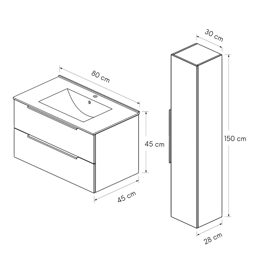 Fürdőszobaszekrény méretek:Szélesség: 80 cmMagasság: 45 cmMélység: 45 cmKivitel: 2 fiók
