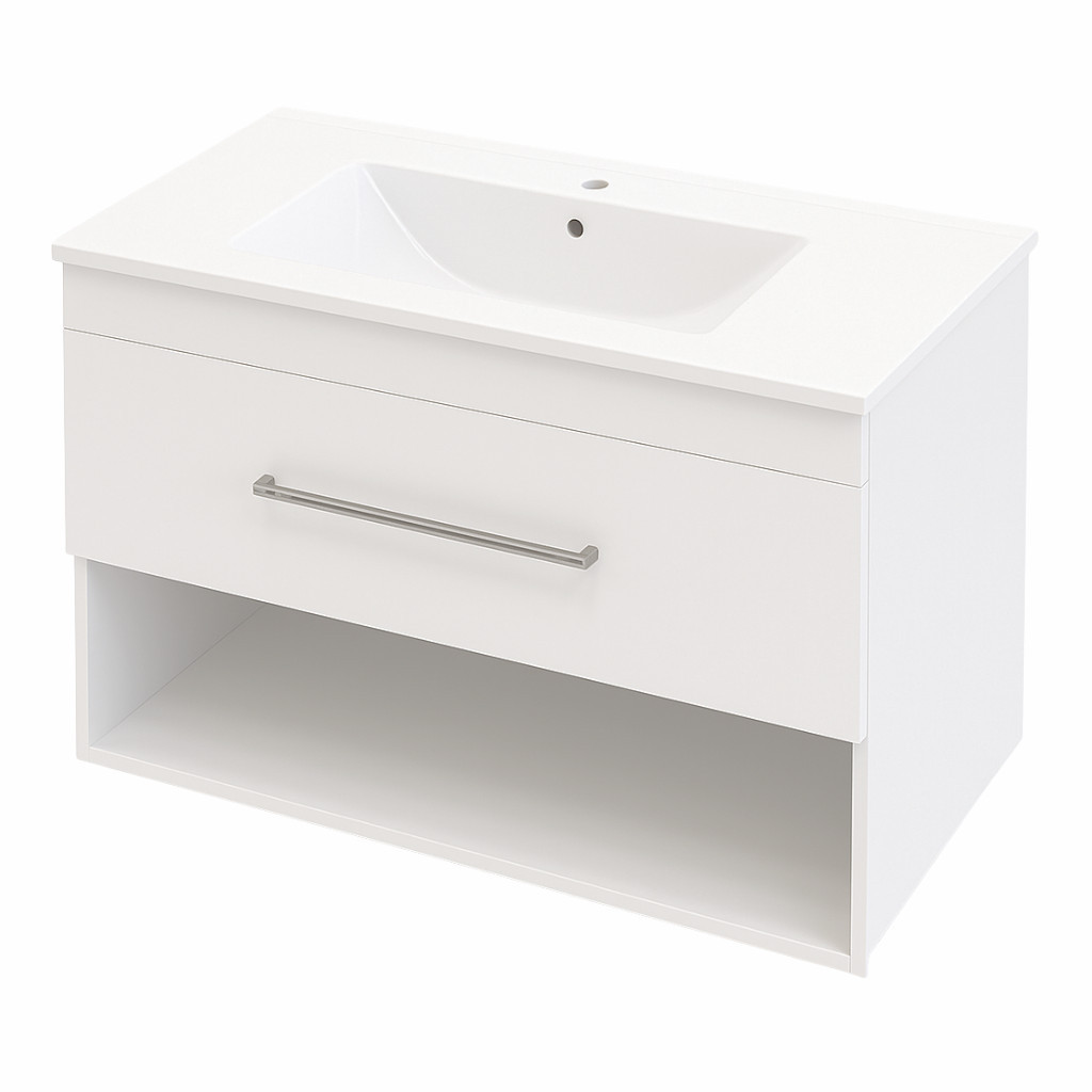 Intenso Verso mosdószekrény magasfényű fehér felülettel. Egy fiókos kialakítás nyitott alsó polccal, ami ideális törölközők és higéniai eszközök tárolására. A fiók előlap mellett az oldalak is magasfényű felülettel készülnek. Az élek ABS élfóliával vannak lezárva, ami egyszerre esztétikus és véd a beázás ellen. A bútorszett lapra szerelve, gyári csomagolásban kerül kiszállításra. Az illusztráción található mosdókagyló és csaptelep nem része az ajánlatnak.