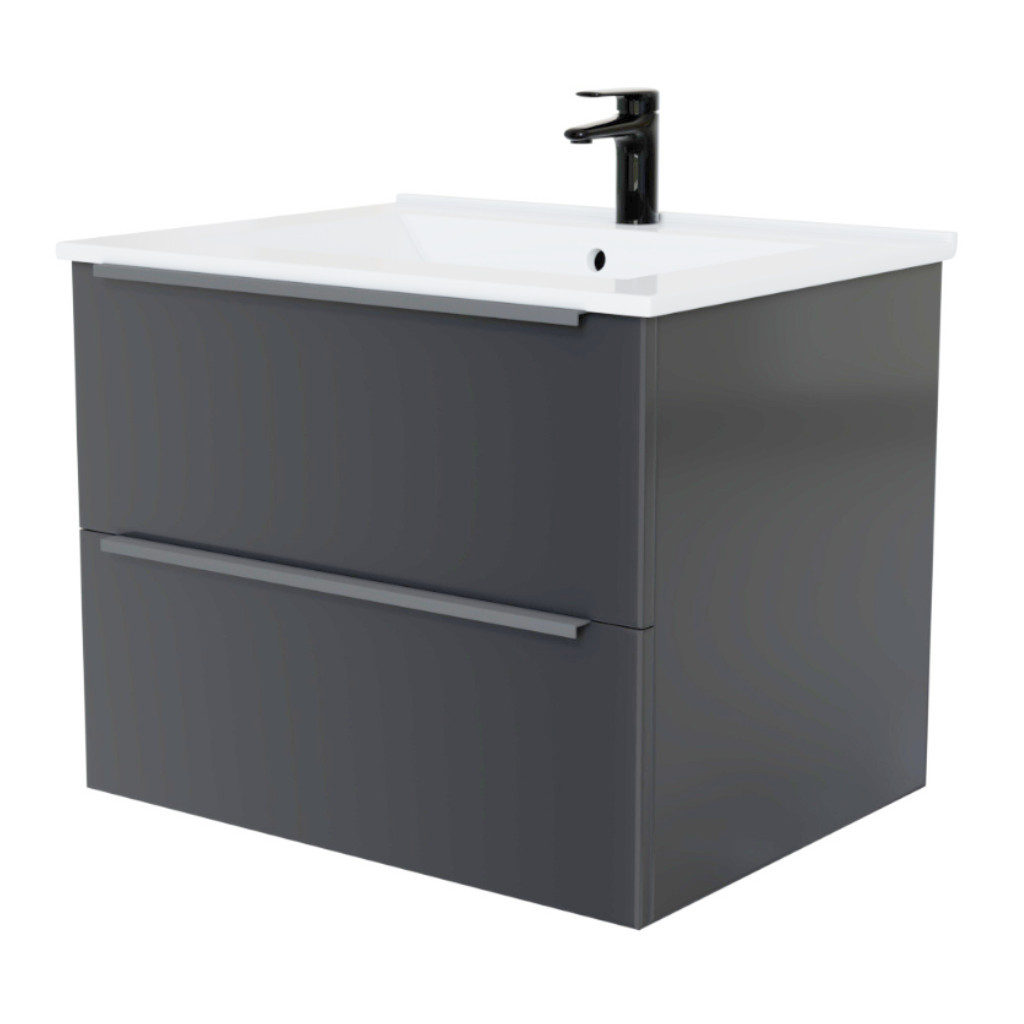 Intenso fiókos mosdószekrény magasfényű szürke felülettel. A fiók előlapok mellett az oldalak is magasfényű felülettel készülnek. 2 fiókos mosdószekrény, modern, hosszított kialakítású fekete fogantyúkkal a fiókokon. 15 mm vastag fiók front bútorlapok és korpusz. Az élek ABS élfóliával vannak lezárva, ami egyszerre esztétikus és véd a beázás ellen. A bútorszett lapra szerelve, gyári csomagolásban kerül kiszállításra. Mosdókagyló nélkül.