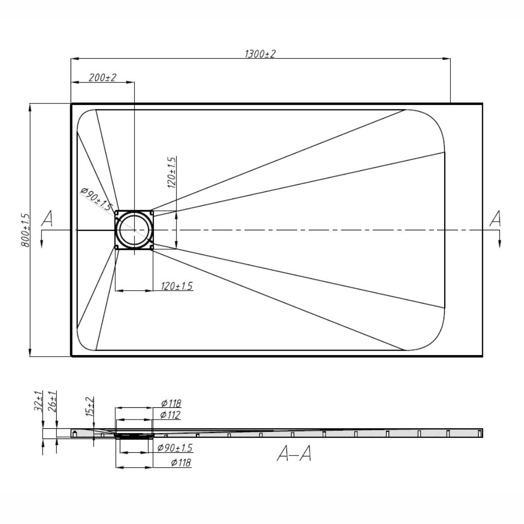 Szélesség: 80 cmHosszúság: 130 cmMagasság: 2.6 cm (lefolyó torkolattal 3.2 cm)Lefolyó átmérő: 90 mm